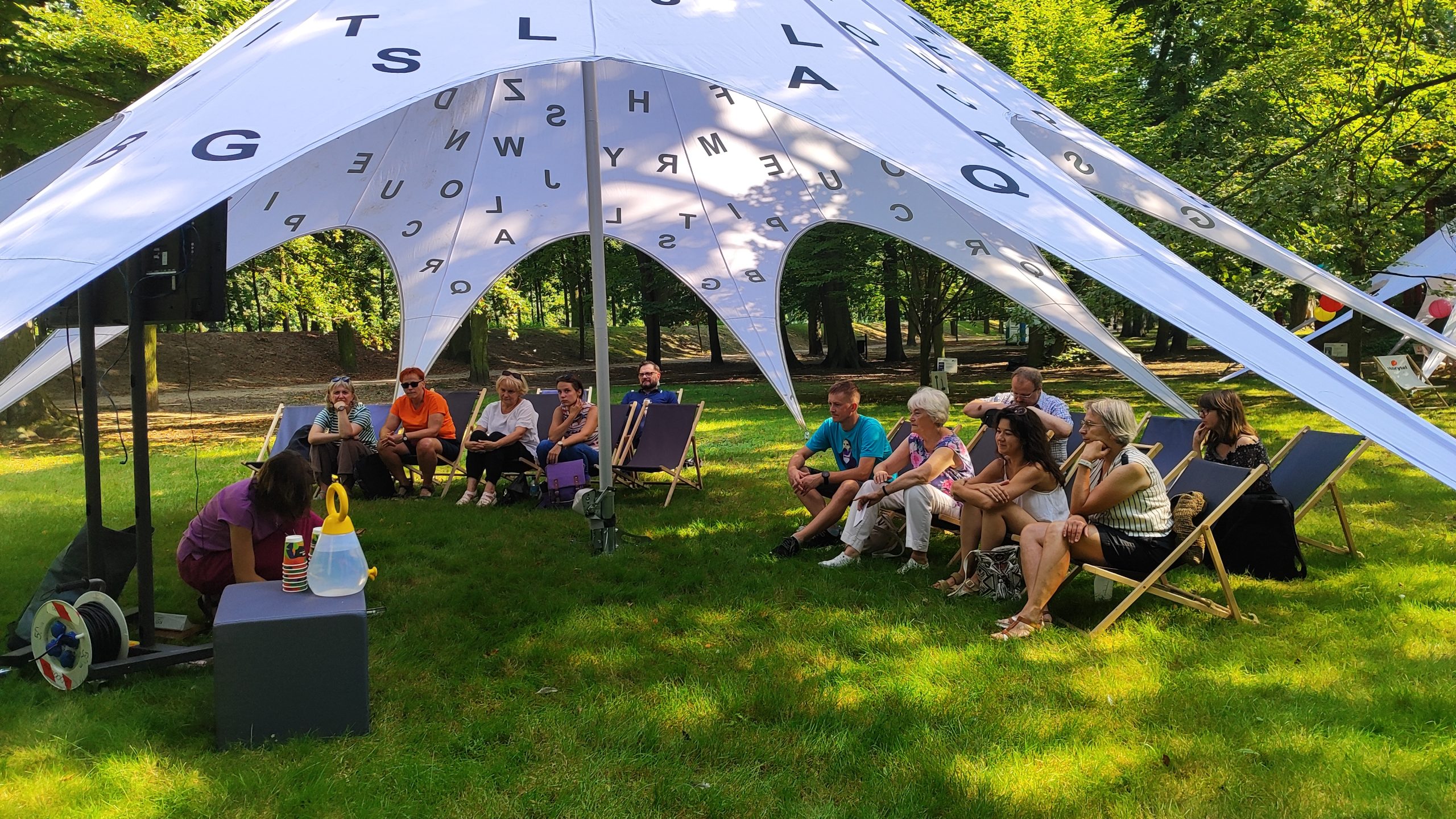 W tym czasie w Parku Miejskim, nieopodal chińskiej pagody, powstawało miasteczko namiotów, w których od godziny 15.00 odbywały się spotkania, dyskusje i warsztaty dla dzieci oraz dorosłych. Podczas gdy miłośnicy przyrody i piękna kaliskiego parku wyruszyli na spacer ze Stanisławem Łubieńskim, namiot Faktycznego Domu Kultury wypełniły warsztaty dyskutowania o książkach z Magdaleną Gościniak, podczas których uczestnicy podzielili się swoimi odczuciami, jakie towarzyszą im przy czytaniu książek i dyskusjach o nich. Liczne grono warsztatowiczów stanowili członkowie „dialogów literackich” odbywających się w Filii nr 1 po opieką Michała Hynasa. W namiocie Domu Kultury odbył się także wykład dr. inż. Leszka Szczupaka z Uniwersytetu Kaliskiego pt. „Inteligencja, wiedza, logistyka”, nawiązujący do tegorocznego hasła Festiwalu: „Inteligencja, wiedza, mądrość”. Nie mogło zabraknąć stałego punktu programu Festiwalu po Drodze, czyli lekcji poezji prowadzonej przez Julię Fiedorczuk. Głośne czytanie, rozmowa o wybranych przez prowadzącą wierszach, próba ich interpretacji – tym razem były to teksty Krystyny Miłobędzkiej, Andrzeja Sosnowskiego i Joanny Mueller. W kilkuosobowym gronie, które szukając wyciszenia przeniosło się na czas lekcji nieco w głąb parku, udało się życzliwie, wnikliwie, uważnie odczytać i podyskutować o wierszach autorstwa trojga niezwykle ważnych dla współczesnej poezji postaci. Powstało mnóstwo ciekawych i różnorodnych interpretacji, a formuła „co autor/ka chciał/a powiedzieć?” ustąpiła refleksji – co wiersze mówią do nas i o nas, co my z nich odczytujemy i co w nas zostaje po lekturze.