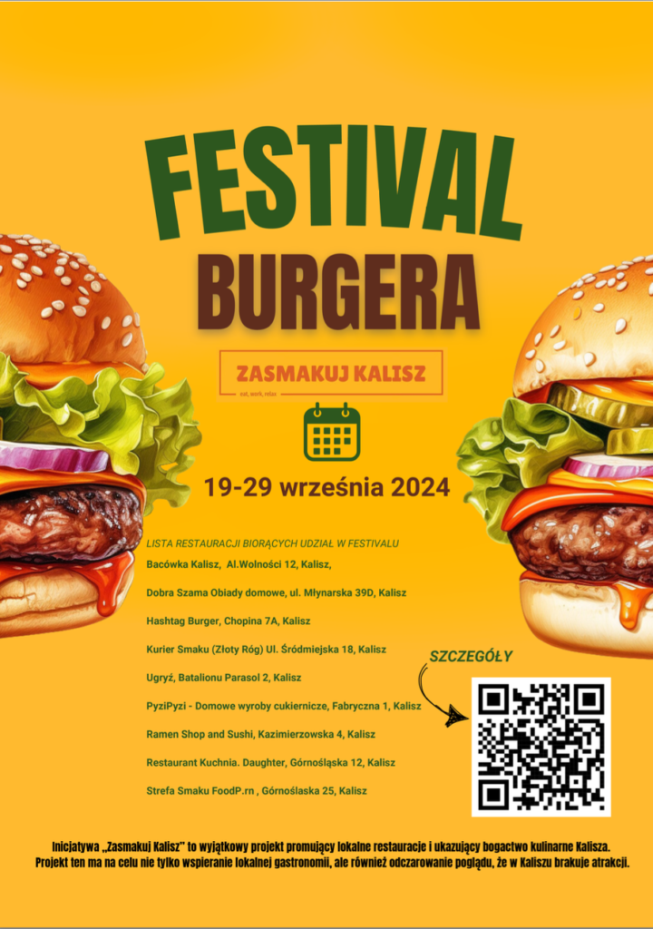 Każdy lokal przygotowuje coś wyjątkowego, smakosze mogą liczyć na oryginalne propozycje, od klasycznych wersji po niezwykłe połączenia smakowe. Więcej informacji i pełna lista restauracji dostępna na stronie: www.zasmakujkalisz.pl oraz na wydarzeniu na Facebooku: Burger Festiwal Kalisz.